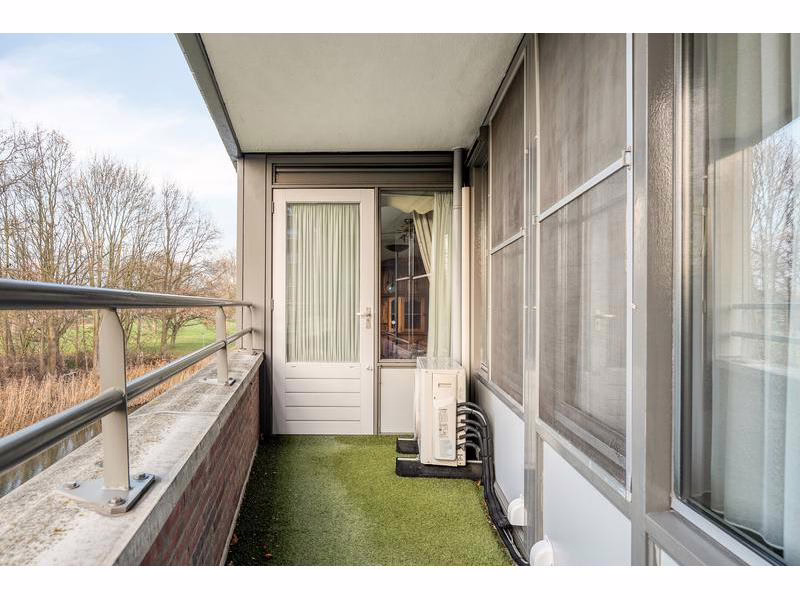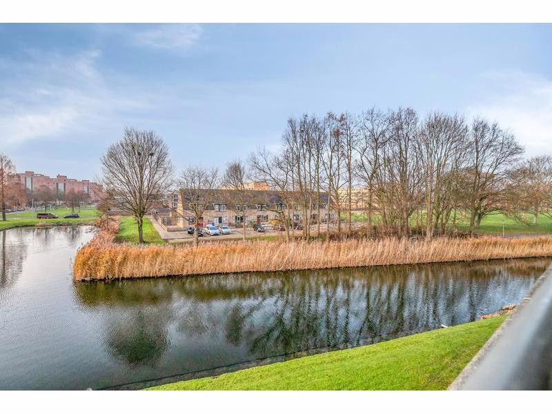 Geniet van het zonnige balkon dat uitzicht biedt op het water en het groene gebied. De omgeving is open en biedt een fijne verbinding met de natuur.