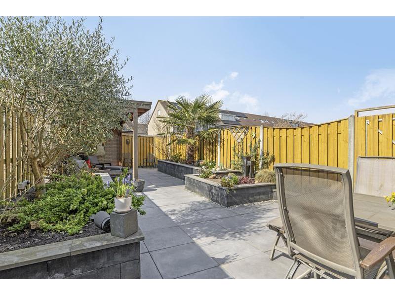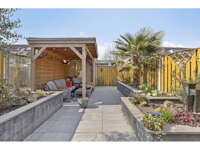 De zonnige achtertuin van ca. 13 meter diep is gelegen op het westen en beschikt over sierbestrating, verhoogde plantenborders en een sfeervolle houten overkapping. De houten schuttingen zorgen voor privacy en de tuin is optimaal te bereiken via een achterom.