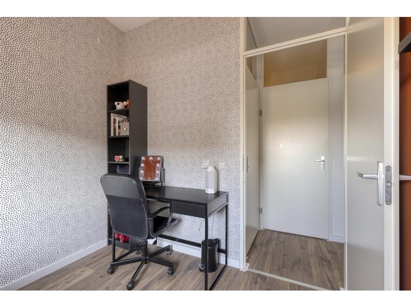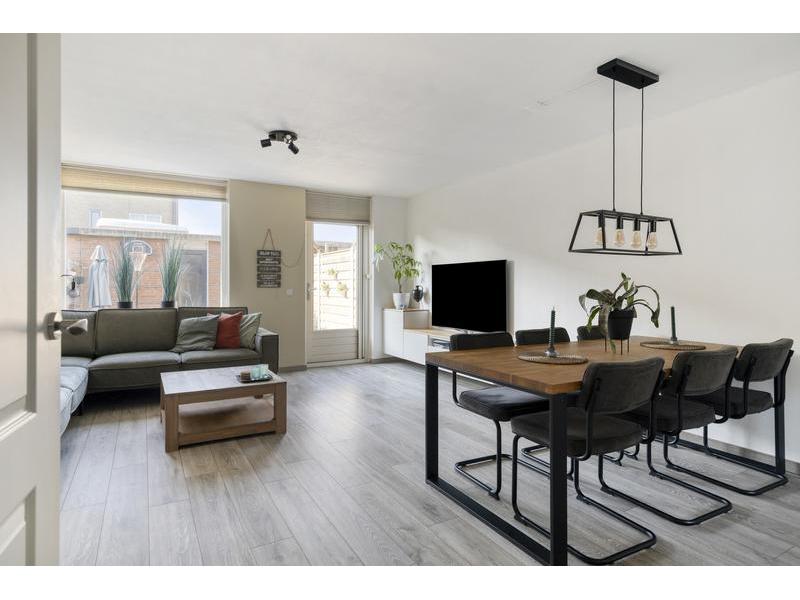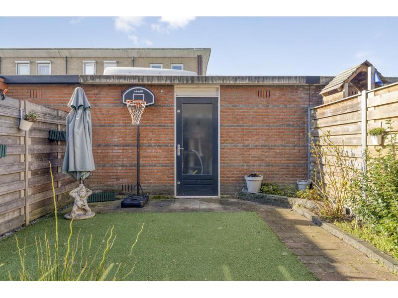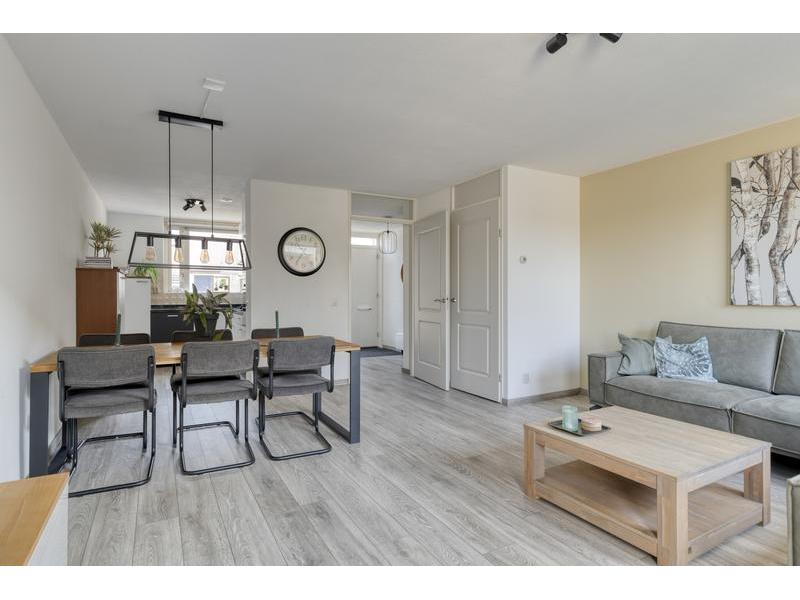 Begane grond: entree met ruime hal, betegeld toilet met fonteintje, meterkast en trapopgang. Vanuit de hal toegang tot de woonkamer met trapkast en de halfopen keuken aan de voorzijde; via de woonkamer is de achtertuin bereikbaar. Eerste verdieping: overloop met vaste kast waarin de cv-installatie en extra bergruimte met wasmachine- en drogeraansluiting. Een ruime slaapkamer over de volle breedte aan de voorzijde en twee slaapkamers aan de achterzijde. De badkamer is volledig betegeld en voorzien van inloopdouche, toilet en wastafelmeubel.