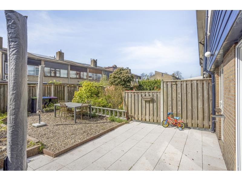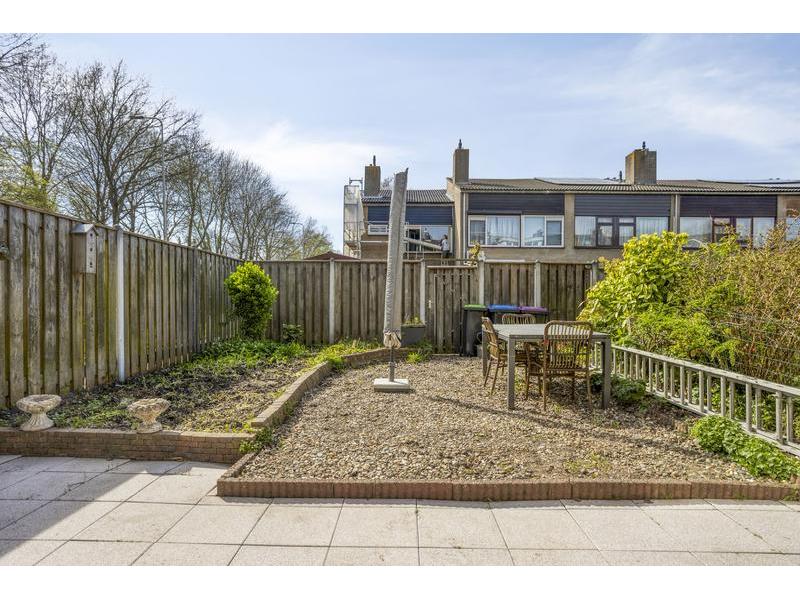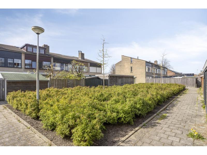 Diepe, zonnige achtertuin op het westen met terras, grind en beplanting en een praktische achterom. Voorzijde met aangebouwde stenen berging voorzien van elektra. Geen garage vermeld.