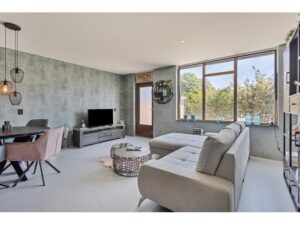 De woning biedt veel comfort en licht dankzij grote ramen en een moderne open keuken. De strakke gietvloer met vloerverwarming zorgt voor een eigentijdse uitstraling.