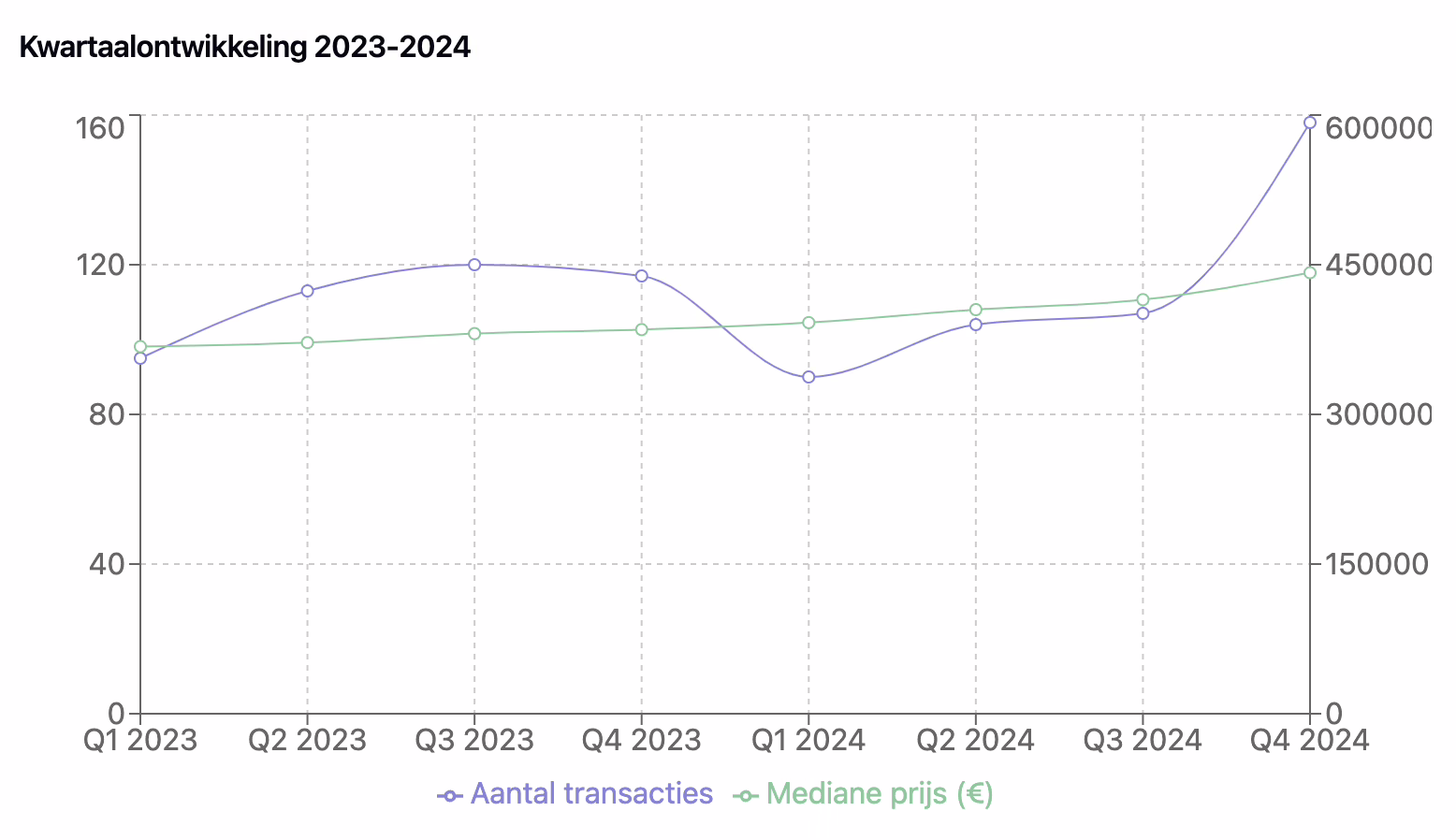 Niet alleen de prijzen gingen omhoog, er werden ook meer woningen verkocht. In totaal wisselden er 5% meer woningen van eigenaar dan in 2023. Vooral het laatste kwartaal van 2024 was druk, met 158 verkochte woningen. Dat is het hoogste aantal in twee jaar tijd.